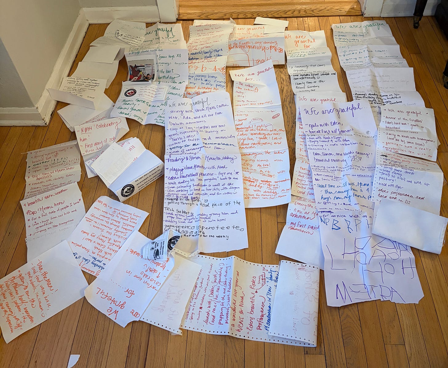 *Let the list-fun continue! :) One of our family practices throughout the year (thank you Traci Smith !!) is to keep a long, paper gratitude list on our kitchen wall. When one fills up, we put up a new one, and then we read the lists together on New Year’s Eve at the end of the year (or as close to it as we can). We did the same thing with the family vision board we made last year, looking at it and realizing a lot of the things on our board ended up being a part of our year. I encourage you to try it this year! You can use some paper, a white board, even post-it notes on a wall where people in your home (or it can be a solo practice) write gratitudes throughout the year. We know that gratitude changes everything, especially us.